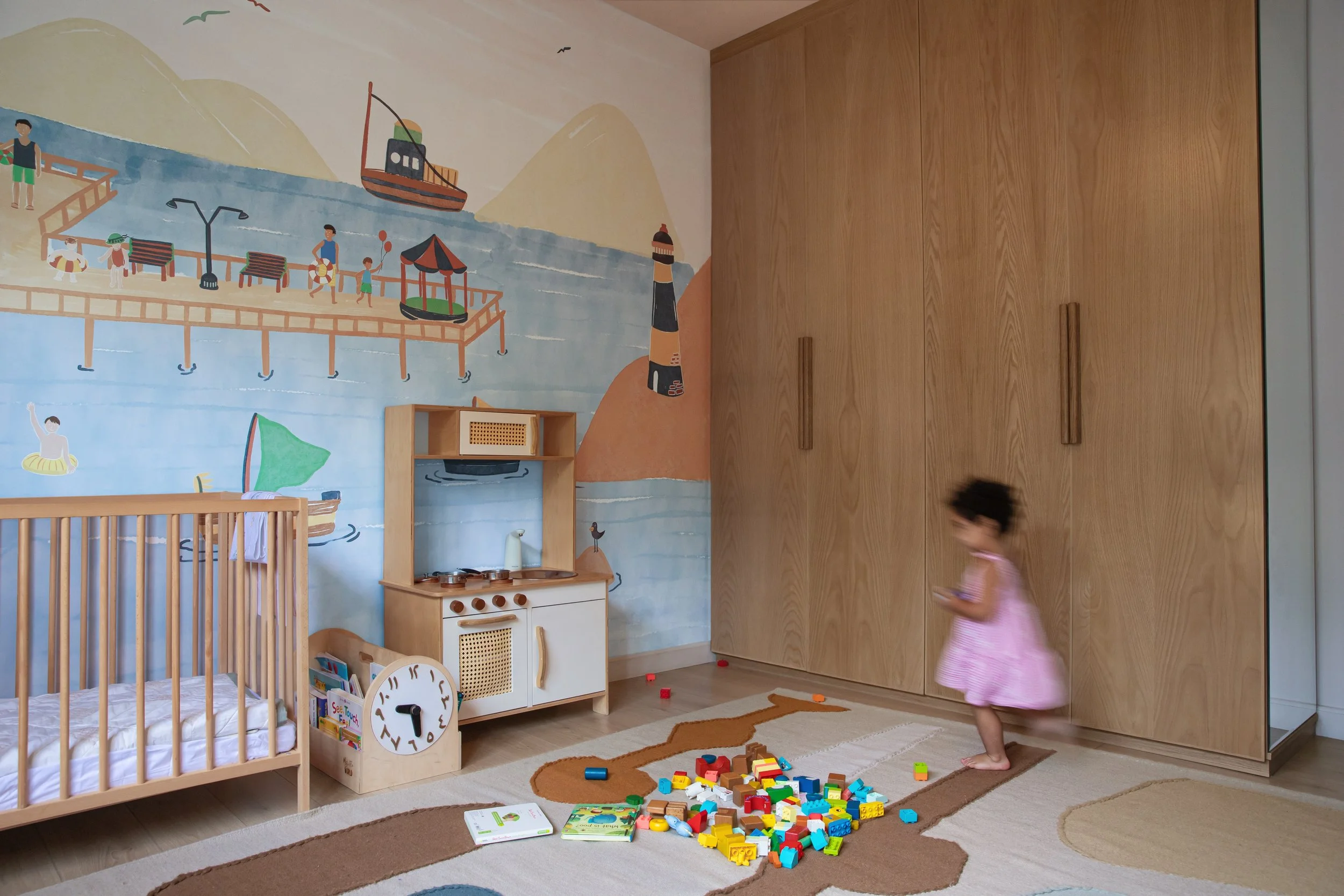 In their children’s room, a Coney Island wallpaper stretches across the wall — a bridge between two worlds, between memory and home.